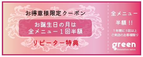 1年間に5回以上ご来店のお客様は、お誕生日の月に1回限り全てのメニューがいくつでも半額となります。